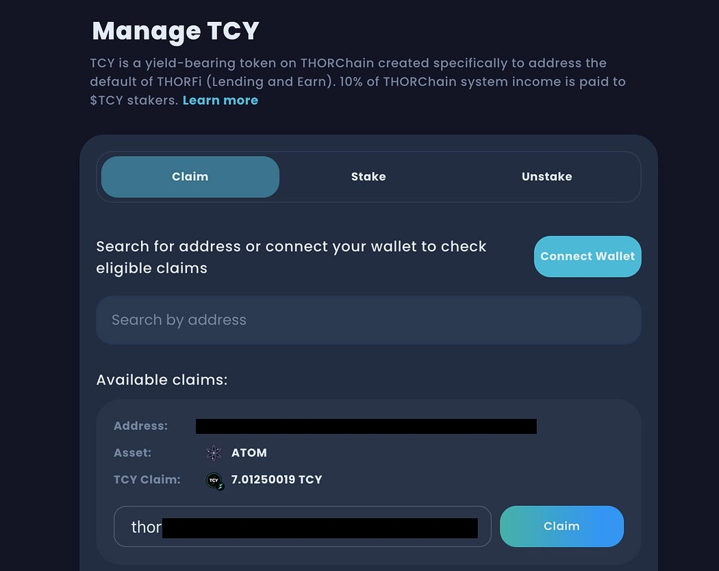 Click the ‘Claim’ button to continue, make sure you have a THORChain wallet (beginning with thor…) connected or manually enter one that you own to receive the $TCY.