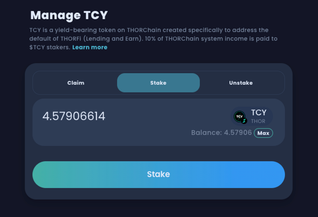 4️⃣ Use Stake/Unstake tabs to manage $TCY. You can buy more $TCY to stake for on-going yield. Or withdraw and provide liquidity via the new TCY/RUNE pool.