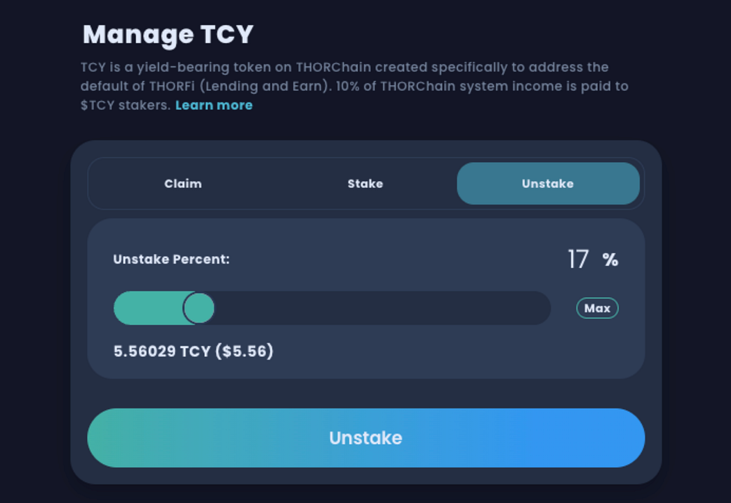 NOTE: Claimed $TCY is automatically staked, earning yield immediately. To view, click the Unstake tab.